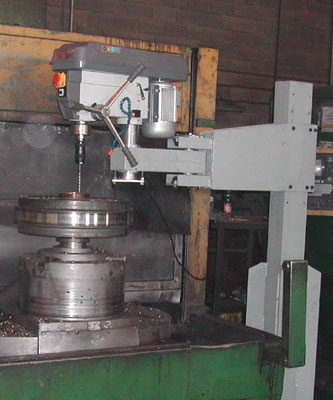Montaje de taladro de columna para horadar engrasadores en ruedas dentadas mecanizadas sobre torno vertical CNC